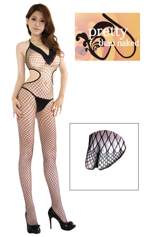 ホルタータイプのボディストッキングは、黒一色の大きめメッシュと美しいバストを強調する胸元のV字が魅力的。