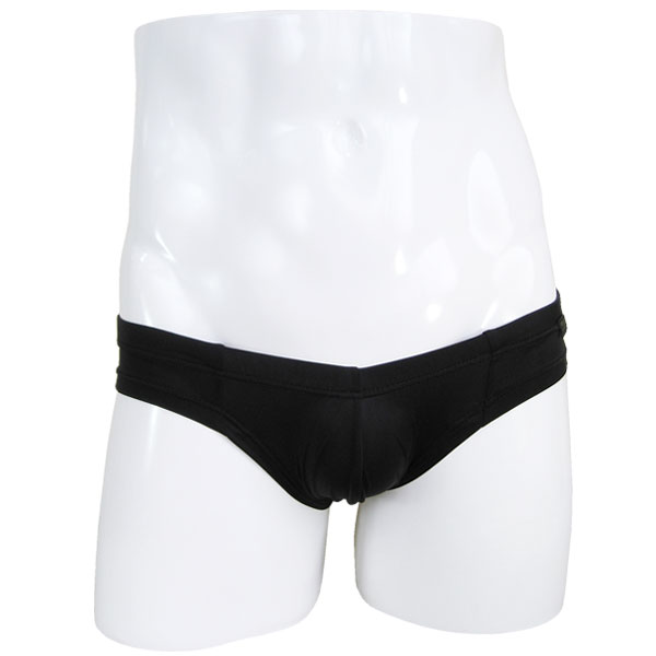 もっこりしたアソコが楽に収まると評判!ブラックカラーの柔らかいストレッチ素材で仕立てた、履きやすいメンズ用ローライズハーフバックショーツです。
