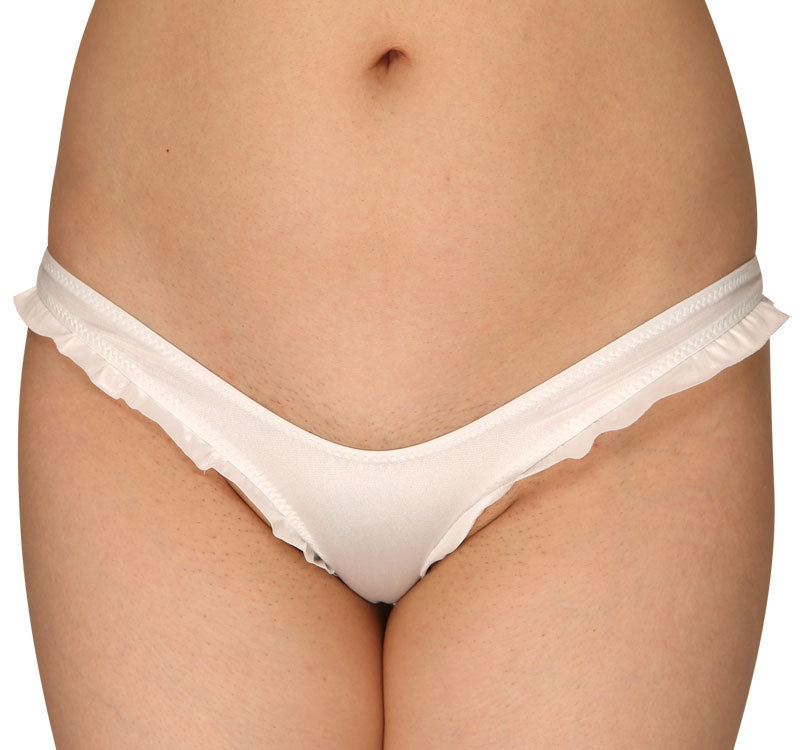 ●ツヤッと輝くパールホワイト●浅い着心地のローライズ仕様●足ぐりを縁取るひらひらフリル●オープンタイプのハーフバック●穴はハート型+フリル付き。
