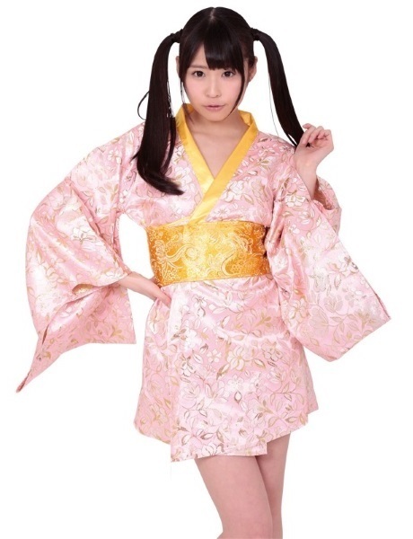 艶やかなサテン生地で仕上げた淡いピンクのミニ着物ワンピース。
