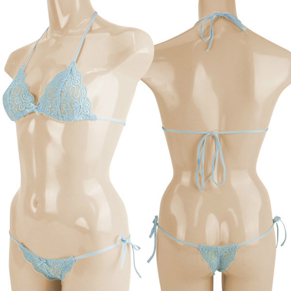 ●爽やかなサックスカラー●あらゆる箇所がうっすら透けて見えるシースルー生地を使用●繊細で美しい花柄刺繍入り●自由にサイズ調節ができる紐タイプ●Mサイズ・日本製。
