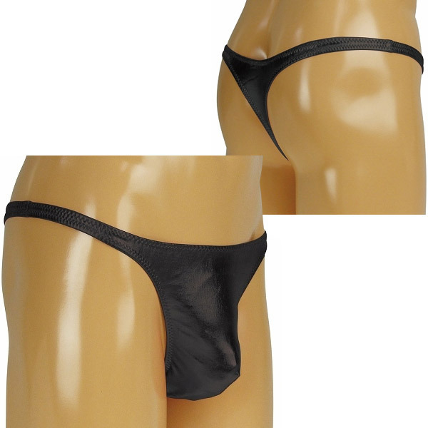 シャイニーなメタリックブラックカラーのTバックタイプ!華奢なサイドストリングとド派手な素材で、セクシーアピールも存在感も抜群の男性用ランジェリーです。