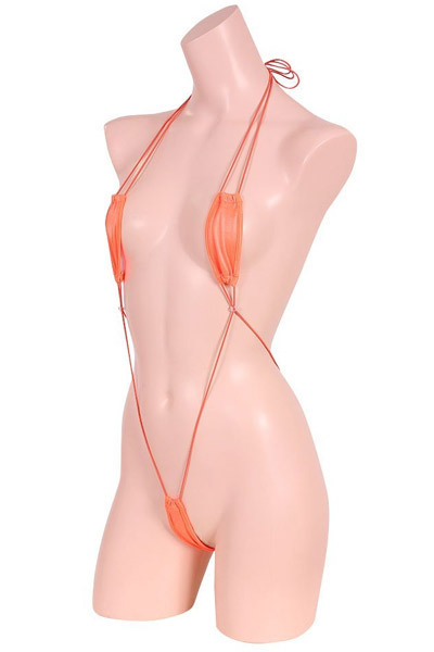 ギリギリ隠れる極小の縦長生地がセクシー!光沢感のあるサラっとしたストレッチ生地のサスペンダーテディ「極小光沢ストレッチプレイスーツ オレンジ」。