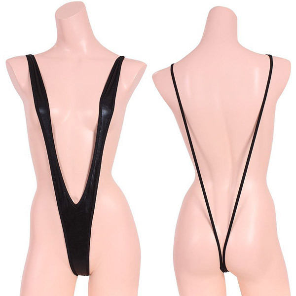 見えそうで見えないギリギリ感がたまらない!超セクシーなメタリック素材のサスペンダーショーツ「V型メタリックプレイスーツ ブラック」。