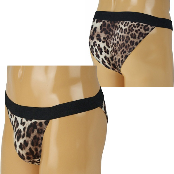 野性味あふれるヒョウ柄生地でキワドイ局部を主張させることで、男性を美しく、より逞しく演出します♪さらに、太めの黒いウエストゴムで身体をガッチリとホールドしてくれる安心感のある穿き心地も追求。
