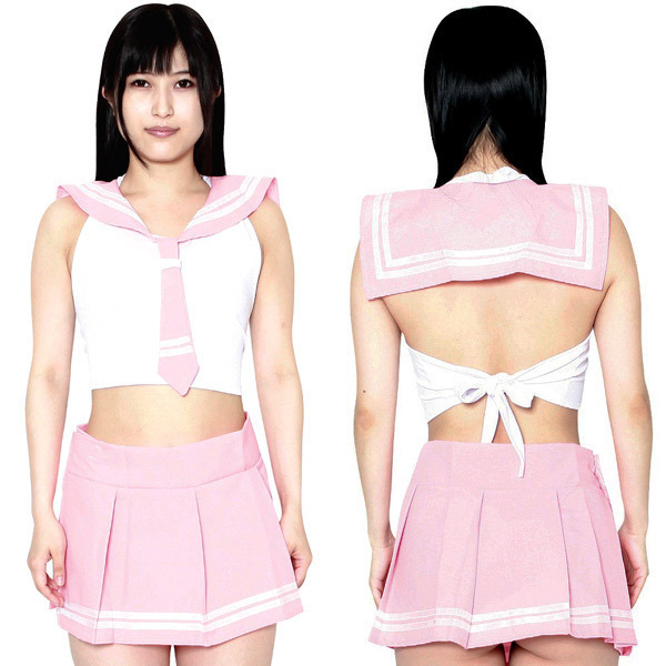 マイクロ丈のプリーツスカートと、背中で結ぶタイプのストレッチトップスの2点セット♪大きく開いた背中や短めのスカートから覗くヒップなど、後姿にドキッとするエロ可愛いセーラーコスプレです。