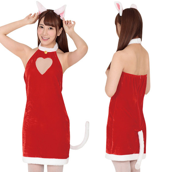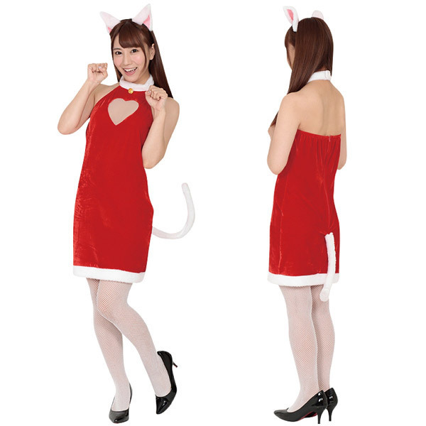 クリスマス、サンタコスチュームの激安通販サイトはコチラ!聖なる夜はふわふわ尻尾付きの可愛いクリスマスコスプレで盛り上げるにゃん♪赤×白のノースリーブワンピースと猫耳カチューシャの2点セット。