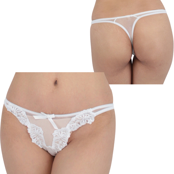 透け感のあるシースルー生地とエレガントな花柄レースで装飾された日本製Tバック。バックは食い込みがセクシーなTバック仕様で、フロント部分を美しく可憐な花の刺繍で飾るホワイトカラーの女性用ショーツです♪