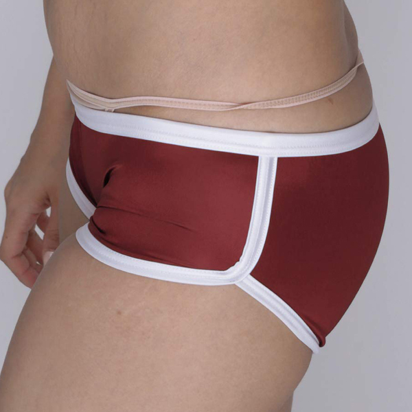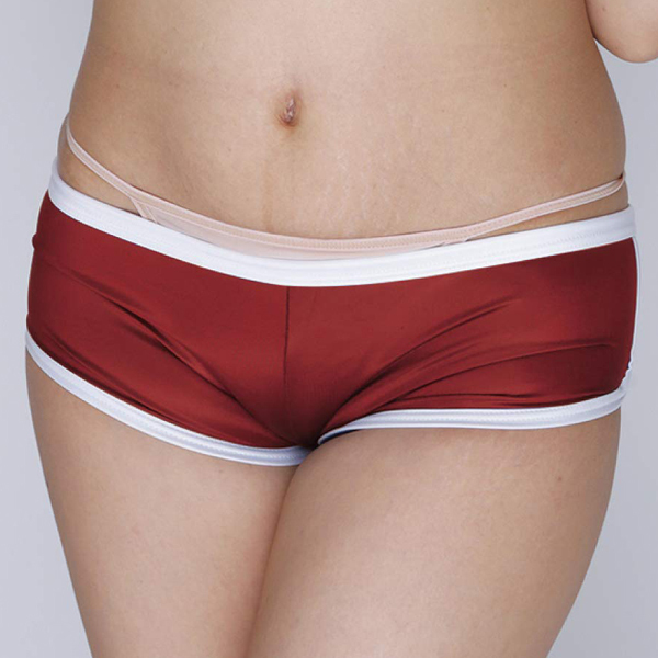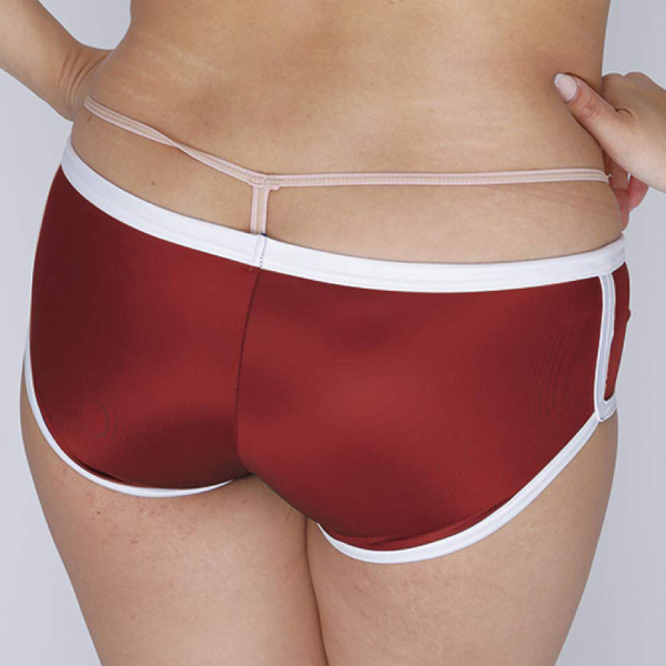 ホットパンツとブルマが合体したようなデザインが特徴的!やわらかな光沢感が美しい日本製の体操服コスプレ(エンジ)。