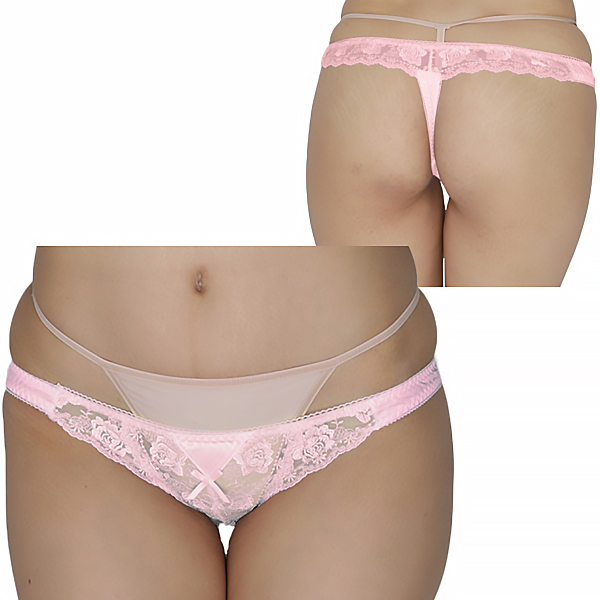 透け感のあるエレガントな花柄レースと光沢感がラグジュアリーな日本製Tバック(ピンク)。