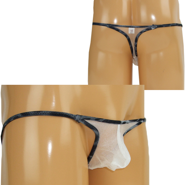 通気性に優れたキラキラ光るシースルー生地をヒョウ柄のパイピングで縁取ったメンズ用のセクシーTバック♪透け素材×マイクロ生地でエロティックに魅せつけろ!