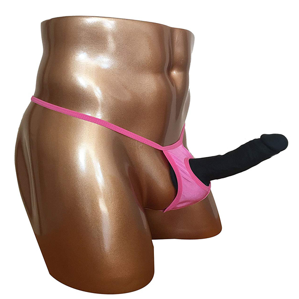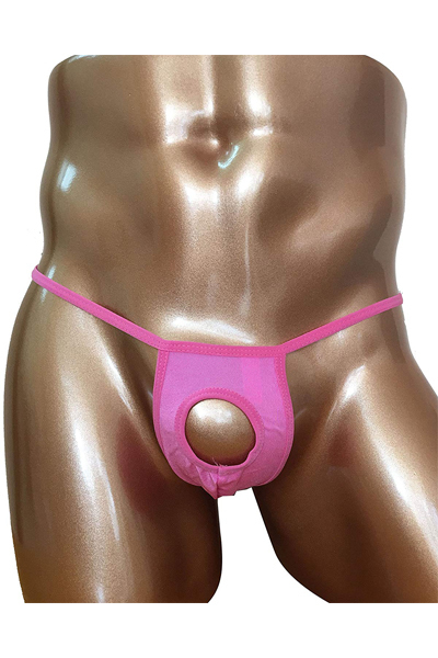 男のシンボルを大胆に露出する穴あき仕様のメンズ用Tバック(ピンク)。