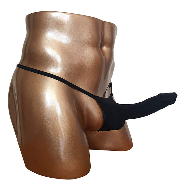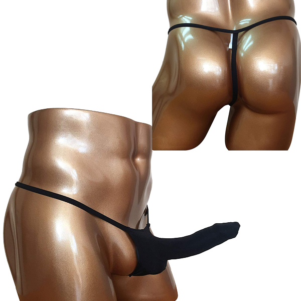 下半身に優しくフィットするサオ収納ポケット付きメンズ用Tバック(黒)。