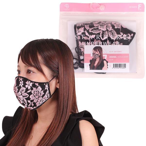 薔薇刺繍レースメッシュマスク ピンク