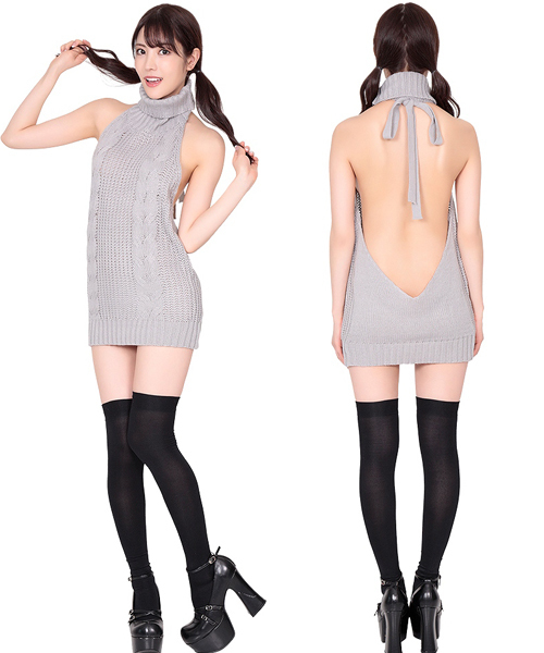 ホルターネックでサイドとバックが大きく開いたグレーカラーの人気ニットセーター。そのまま着ても良し、アウターやトップスを組み合わせてオリジナルのコーディネートを楽しんでも良し!アレンジ次第でお洒落の幅が広がる大人可愛いセーターです。