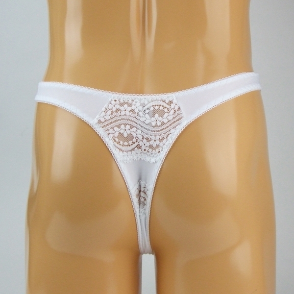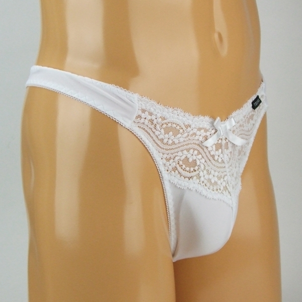 清潔感のあるホワイトカラーが魅力のメンズ用Tバックです♪繊細なレースと伸縮性のあるストレッチ素材を組み合わせ、上品でやさしい印象に仕上がっています!軽やかな着用感とフィット感を両立し、日常使いにもぴったりです♪フロントにあしらわれたリボンがさりげないアクセントになっています!バックスタイルはすっきりとしており、シンプルな美しさを演出します♪こだわりのディテールが光る一枚です!