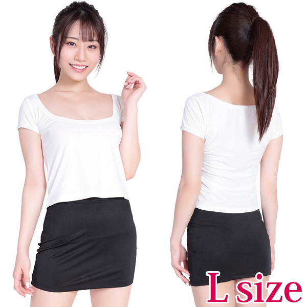 | ■サイズ/ セット内容 | Lサイズ:Tシャツ(着丈47cm・袖丈12cm)、ミニスカート総丈37cm、サイズ目安(B86〜94cm・W69〜77cm・92〜100cm) パッケージ:28.0×16.0×1.6cm セット内容:Tシャツ、ミニスカート | ||