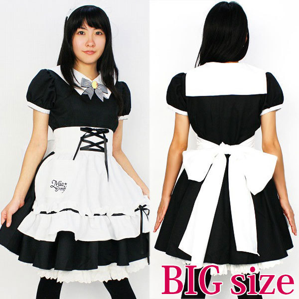 | ■サイズ/ セット内容 | BIGサイズ:B92〜100cm・W78〜84cm 丈:ワンピース88cm(袖丈19cm)・ペチコート50cm セット内容:ワンピース(後ろファスナー、袖パフスリーブ、全円スカート、内側に襟固定用のボタン付)・エプロン・ペチコート(裾レース付、ウェストゴム仕様)・カチューシャ・ブローチ(安全ピン付) | ||