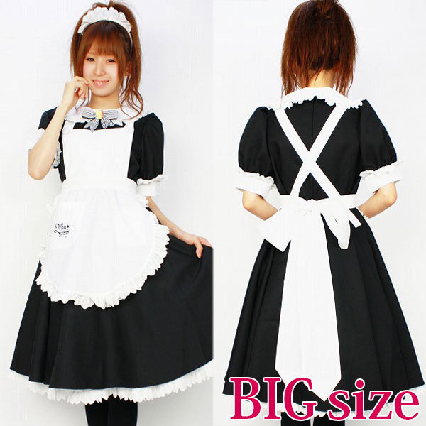 | ■サイズ/ セット内容 | BIGサイズ:B92〜100cm・W78〜84cm 丈:ワンピース108cm(袖丈30cm)・ペチコート67cm セット内容:ワンピース(後ろファスナー、袖パフスリーブ、袖、襟繰りにレース付)・エプロン(肩紐下部にボタン付、ポケット付)・ペチコート(裾レース付、ウェストゴム仕様)・カチューシャ(全フリル)・ブローチ(安全ピン付)・メイドキャップ(クリップ付) | ||