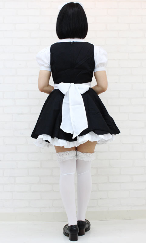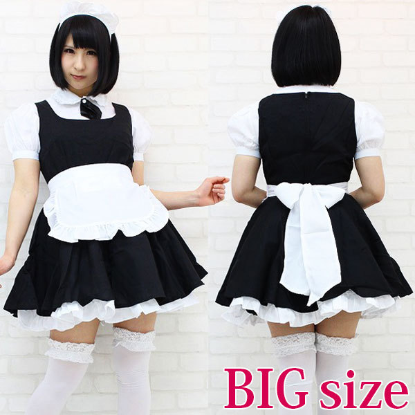 | ■サイズ/ セット内容 | BIGサイズ:B〜104cm・W〜86cm 丈:ワンピース83cm(裾フリル含む)・ブラウス63cm(袖丈25cm、袖幅35cm、肩幅47cm、首周り43cm) セット内容:ブラウス、タイ(ナップボタンにて取り外し可能)、ワンピース(背中ファスナー)、エプロン、カチューシャ | ||