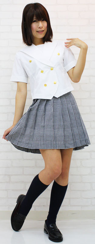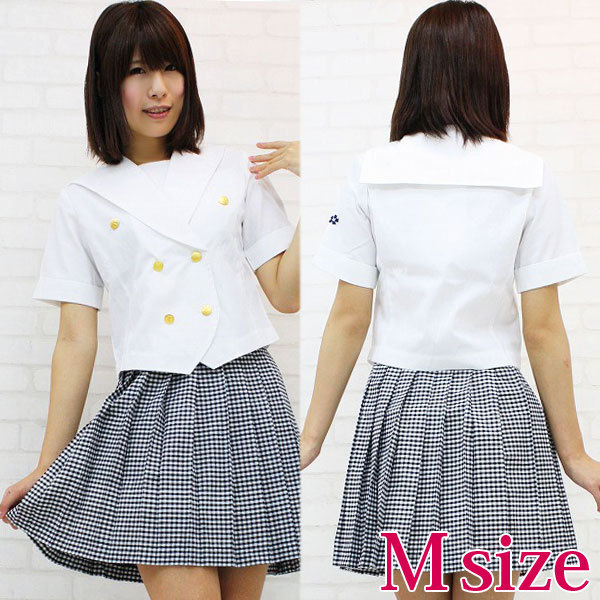 | ■サイズ/ セット内容 | Mサイズ:B78〜88cm・W58〜73cm 丈:上着47cm(袖丈22cm、肩幅36cm)・スカート46.5cm セット内容:上着(ピケ生地使用、前ボタン留め、金ボタン、左袖に校章付き)・スカート(横ファスナー、アジャスター有り、黒ギンガムチェック生地) | ||