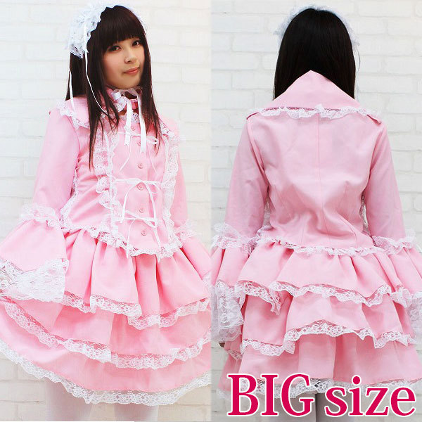 | ■サイズ/ セット内容 | BIGサイズ:B〜100cm・W72〜120cm 丈:上着52cm(袖丈65cm・肩幅40cm)・スカート49cm 付け襟(首回り)43cm セット内容:上着(前ボタン)・スカート(ウエスト部分ゴム、スカート3枚仕立て、裏地付き、チュールパニエ付き)・付け衿(ボタンにて着脱可)・ヘッドドレス | ||