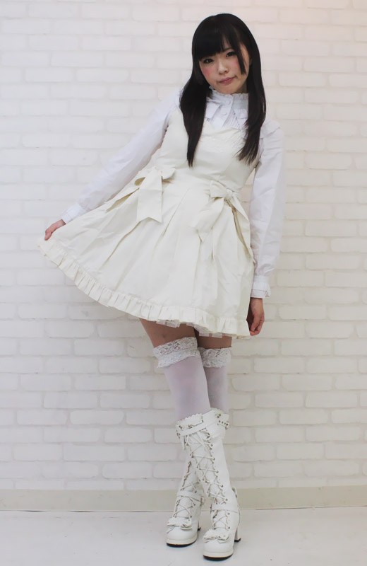 ふんわりフリルが可愛いロリータ服!クラシカルなオフホワイトのジャンパースカート&長袖ブラウスセット(BIG)。