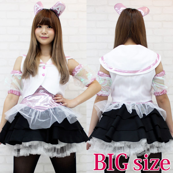 | ■サイズ/ セット内容 | BIGサイズ:B88〜97cm・W68〜82cm 丈:上衣44cm(肩紐34cm)・インナー前身頃丈:45cm・スカート38cm・パニエ40cm・アームカバー(腕囲)約38cm セット内容:上衣(前ボタン)・インナー(サイドファスナー)・スカート(ボタン留め、一部ゴム入り)・パニエ・アームカバー・カチューシャ | ||