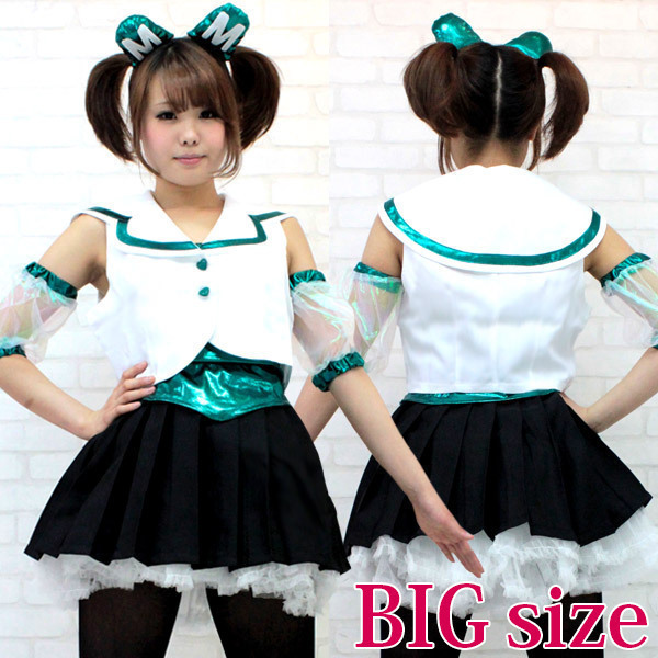 | ■サイズ/ セット内容 | BIGサイズ:B88〜97cm・W68〜82cm 丈:上衣44cm(肩紐34cm)・インナー前身頃丈:45cm・スカート38cm・パニエ40cm・アームカバー(腕囲)約38cm セット内容:上衣(前ボタン)・インナー(サイドファスナー)・スカート(ボタン留め、一部ゴム入り)・パニエ・アームカバー・カチューシャ | ||