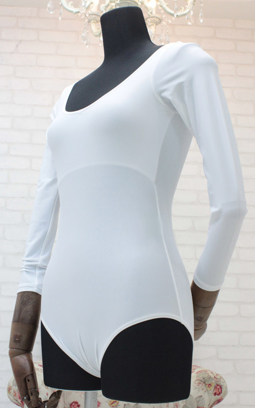 体のラインをキレイに見せる、純白のロングスリーブレオタード(Mサイズ)。