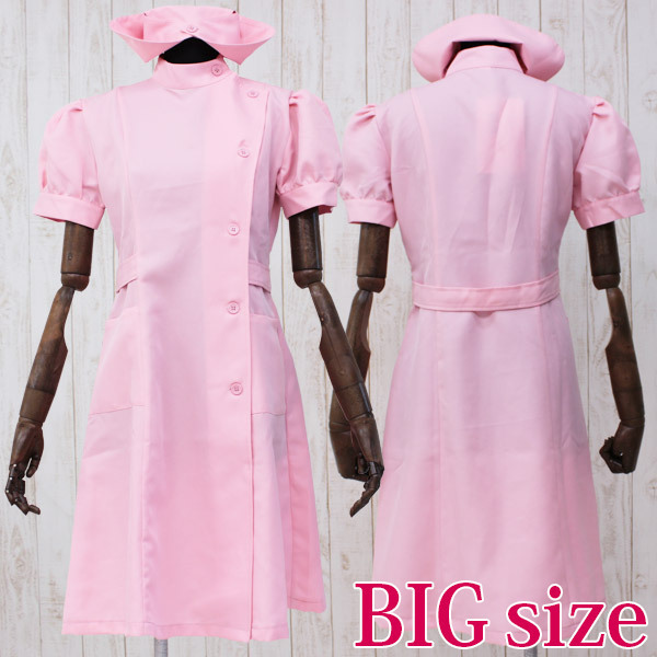 | ■サイズ/ セット内容 | BIGサイズ:B98〜108cm・W86〜96cm ワンピース:着丈110cm 肩幅48cm 首周り45cm 袖丈28cm 袖口周り35cm セット内容:ワンピース(前ボタン留め・立て襟・ポケット付き・裏地無し)、ナースキャップ 素材:ポリエステル100% | ||