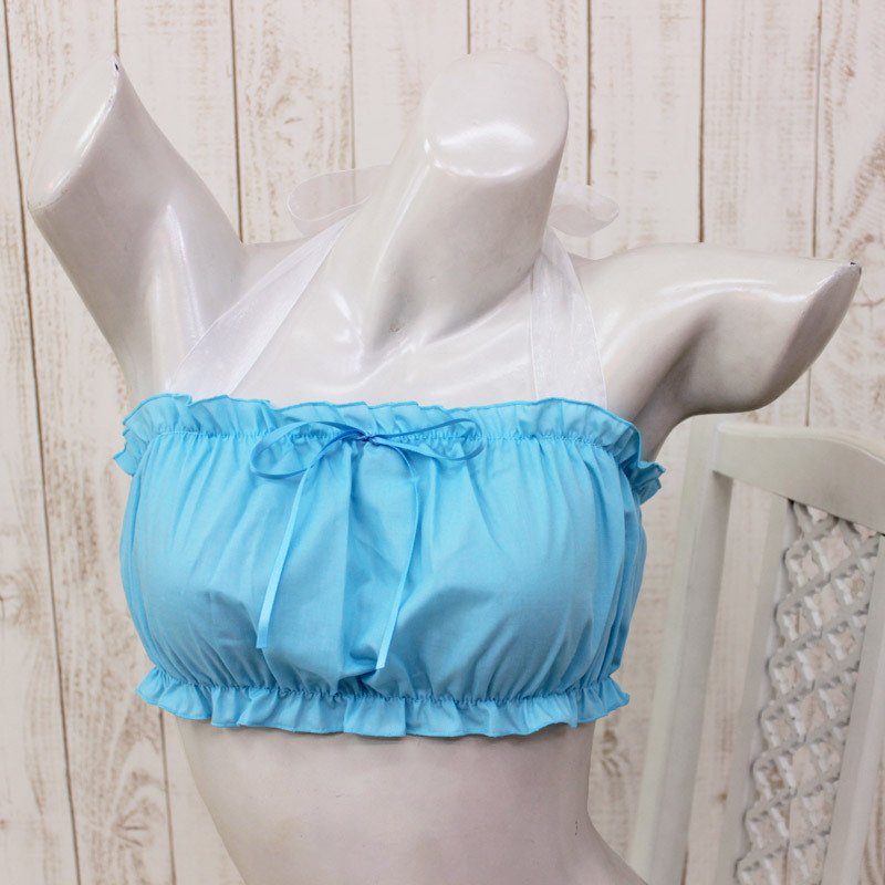 ホルターネックデザインの可愛いブラが誕生!鮮やかなブルーに透け感たっぷりのレースリボンが乙女度をグンとUPさせてくれる女性用ランジェリーです。