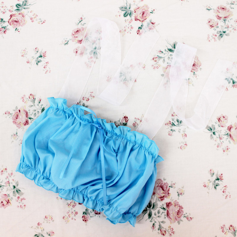 ●鮮やかパステルブルー×ホワイト●上下にたっぷりフリルギャザー●胸の真ん中に繊細なリボン付き●すっぽりかぶるだけの簡単装着●首元は可愛いレースリボン。