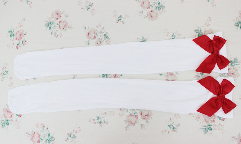 メイド服やアイドル衣装と相性バッチリな赤リボン付きニーハイソックス。