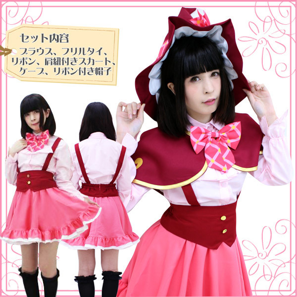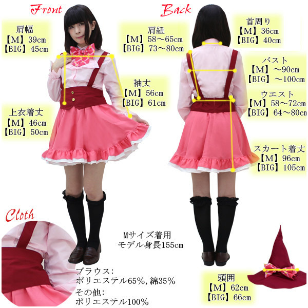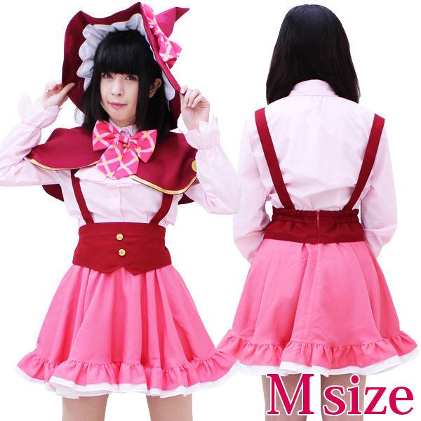 | ■サイズ/ セット内容 | Mサイズ:B〜90cm・W58〜72cm ブラウス(肩幅39cm、袖丈57〜60cm、着丈58cm、首回り36cm) スカート(丈46cm、肩紐58〜65cm) 帽子:頭囲62cm セット内容:ブラウス(前ボタン・袖口ゴム)、フリルタイ、リボン、肩紐付きスカート、ケープ(前スナップボタン留め)、リボン付き帽子(リボン固定用のスナップボタン付) | ||