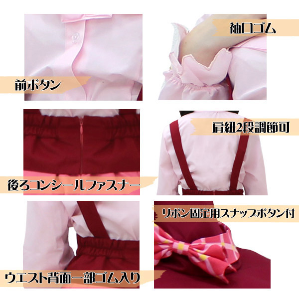 ●花びら風の袖口が可愛いブラウス●パステルピンクのフリルタイ付き●裾フリルたっぷりの吊りスカート●ウエスト後ろゴム&ファスナー●金模様も忠実に再現したケープ●チェック柄リボン付きとんがり帽子●首元用のおそろい柄リボンもセット。