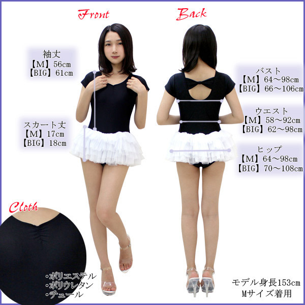 | ■サイズ/ セット内容 | Mサイズ:B62〜98cm・W58〜92cm・H64〜98cm・着丈54cm・袖丈11cm・スカート丈17cm セット内容:レオタード単品(一部当て布付き) 素材:ポリエステル、ポリウレタン、チュール | ||