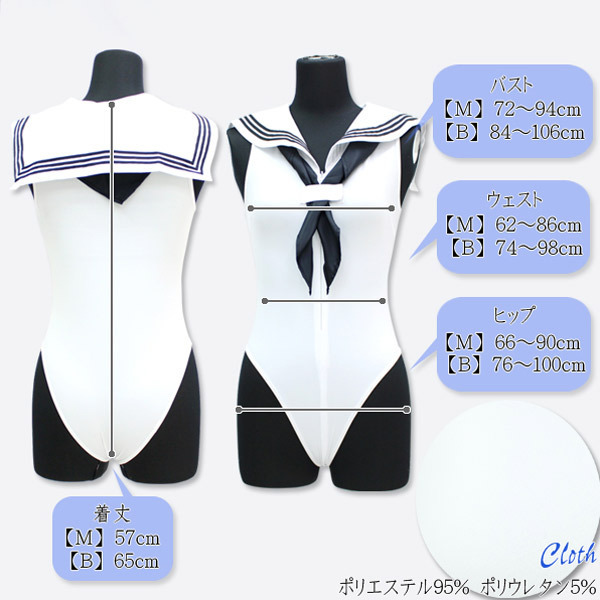 | ■サイズ/ セット内容 | BIGサイズ:B84〜106cm・W74〜98cm・H76〜100cm 着丈65cm セット内容:レオタード(前ファスナー)、スカーフ(マジックテープ) 素材:ポリエステル95%、ポリウレタン5% セーラーノースリーブレオタード 色:白 | ||