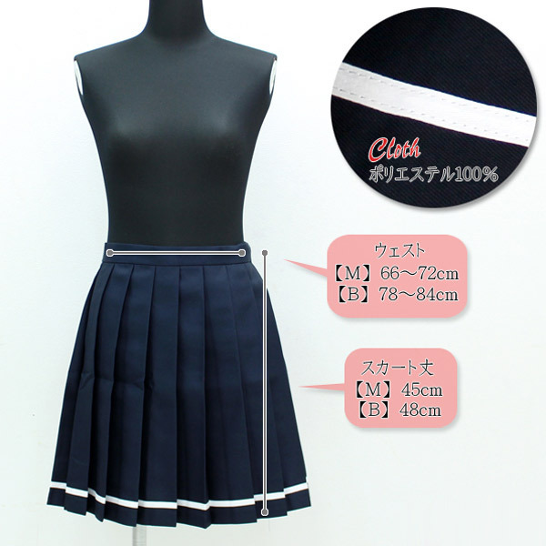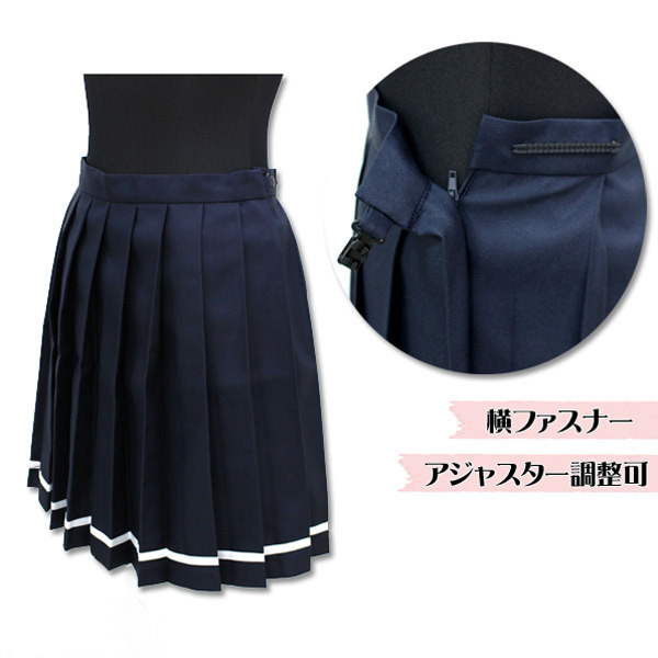 | ■サイズ/ セット内容 | BIGサイズ:W78〜84cm スカート丈48cm セット内容:スカート単品(横ファスナー、アジャスター調節可) 素材:ポリエストル100% 無地プリーツスカート単品 色:紺×白ライン | ||