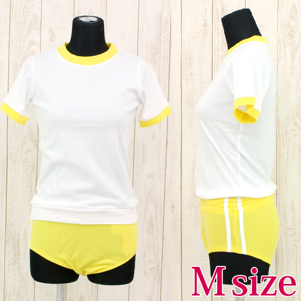 注目度満点の黄色ブルマに白のトップスを組み合わせた可愛い体操服コスプレ♪黄色のブルマのサイドには2本の白ラインを施し本格派デザインに仕上げています。
