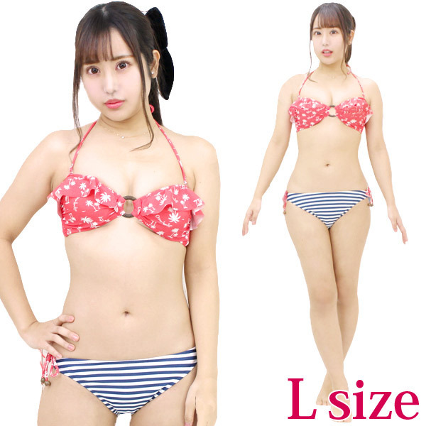 | ■サイズ/ セット内容 | 11Lサイズ:B86cm・H87〜95cm セット内容:トップス(パッド着脱可、ワイヤー無し)、ビキニショーツ 素材:ポリエステル85%、ポリウレタン15% 生産国:日本 | ||