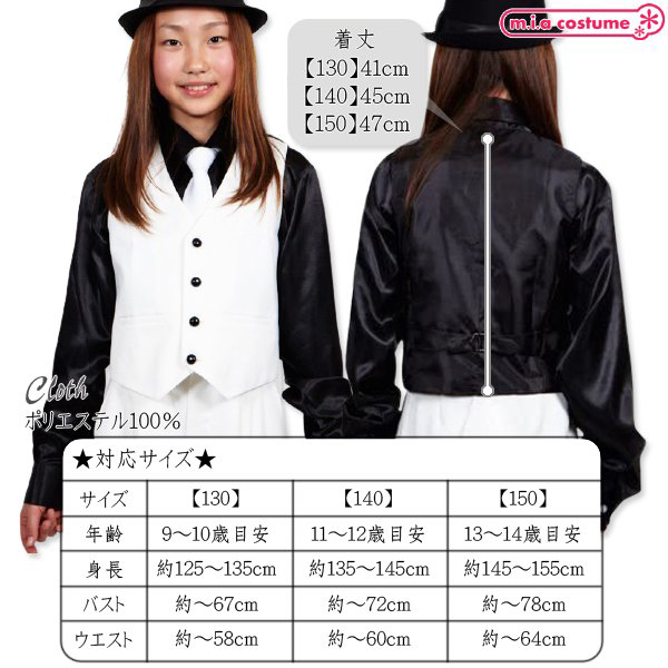 | ■サイズ/ セット内容 | 130サイズ 対応サイズ:身長125〜135cm・B〜67cm・W〜58cm 実寸:着丈41cm セット内容:ベスト単品(前ボタン) 素材:ポリエステル100% | ||