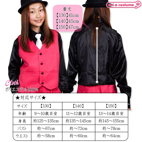 | ■サイズ/ セット内容 | 130サイズ 対応サイズ:身長125〜135cm・B〜67cm・W〜58cm 実寸:着丈41cm セット内容:ベスト単品(前ボタン) 素材:ポリエステル100% | ||