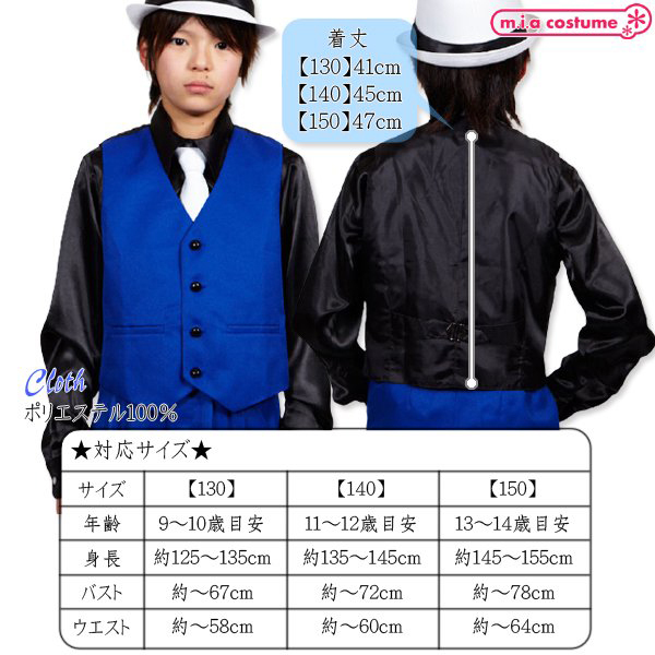 | ■サイズ/ セット内容 | 130サイズ 対応サイズ:身長125〜135cm・B〜67cm・W〜58cm 実寸:着丈41cm セット内容:ベスト単品(前ボタン) 素材:ポリエステル100% | ||