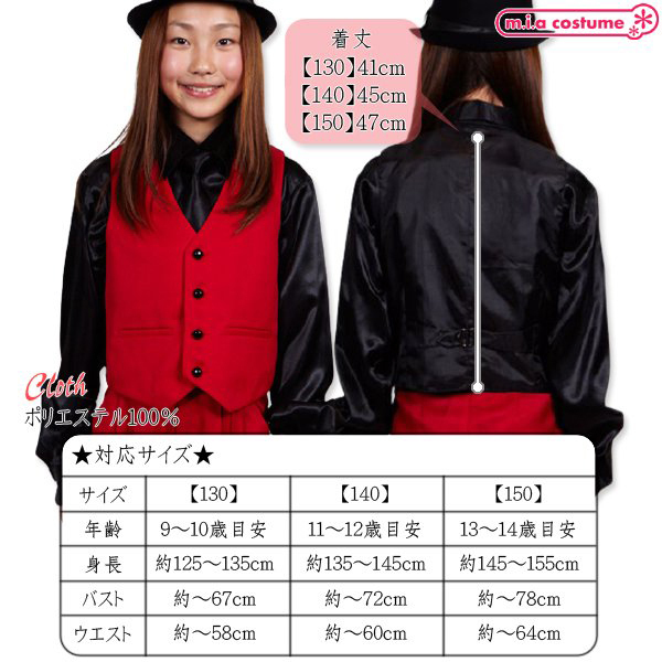 | ■サイズ/ セット内容 | 130サイズ 対応サイズ:身長125〜135cm・B〜67cm・W〜58cm 実寸:着丈41cm セット内容:ベスト単品(前ボタン) 素材:ポリエステル100% | ||