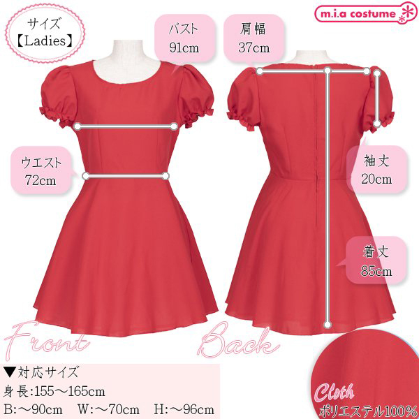 | ■サイズ/ セット内容 | 対応サイズ:身長155〜165cm・B〜90cm・W〜70cm・H〜96cm 実寸:B91cm・W72cm・肩幅37cm・袖丈20cm・着丈85cm セット内容:ワンピース単品(背中心ファスナー) 素材:ポリエステル100% モデル身長155cm | ||