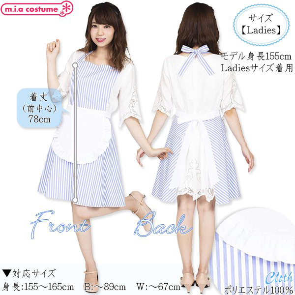 | ■サイズ/ セット内容 | 対応サイズ:身長155〜165cm・B〜89cm・W〜67cm 実寸:着丈78cm(前中心) セット内容:エプロン単品(首リボン、腰リボン) 素材:ポリエステル100% | ||