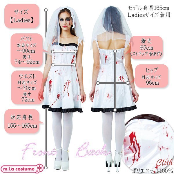 | ■サイズ/ セット内容 | フリーサイズ:身長155〜165cm・B74〜92cm・W72cm・着丈65cm(ストラップ含まず) セット内容:ヴェール付きカチューシャ、ワンピース(裏地無し、背中心ファスナー)、血糊 素材:ポリエステル100% | ||