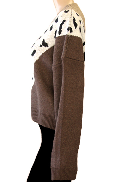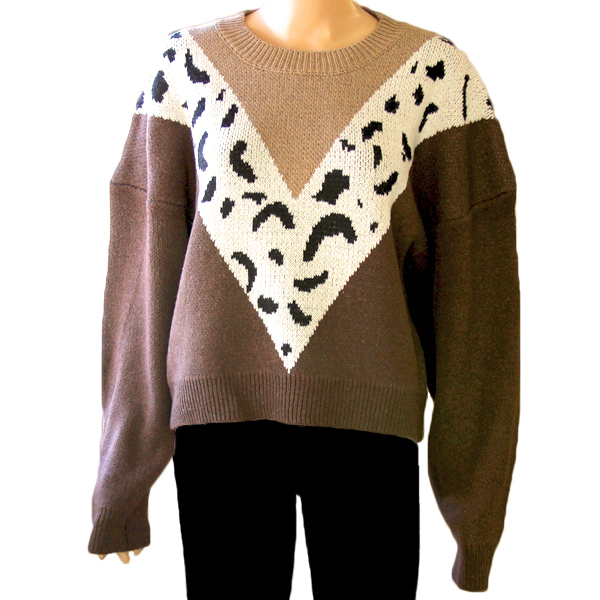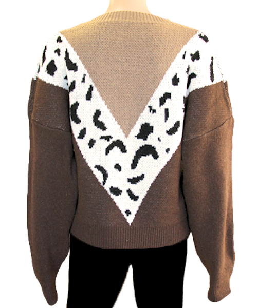 ヒョウ柄模様がV字にデザインされた暖かなニットセーター。