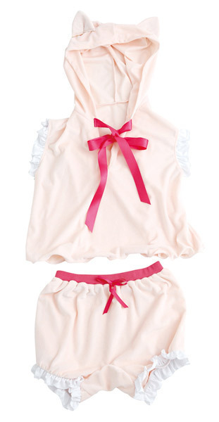耳が自立する大きめフードとピンクリボンが可愛らしいくつろぎスタイルのお部屋着コスチューム。